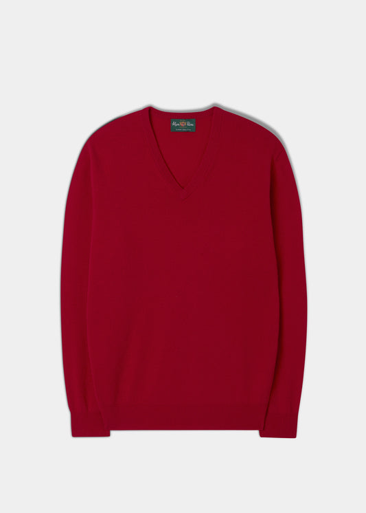 Men's Geelong Lambswool Vee Neck Jumper in Raspberry - Regular Fit
